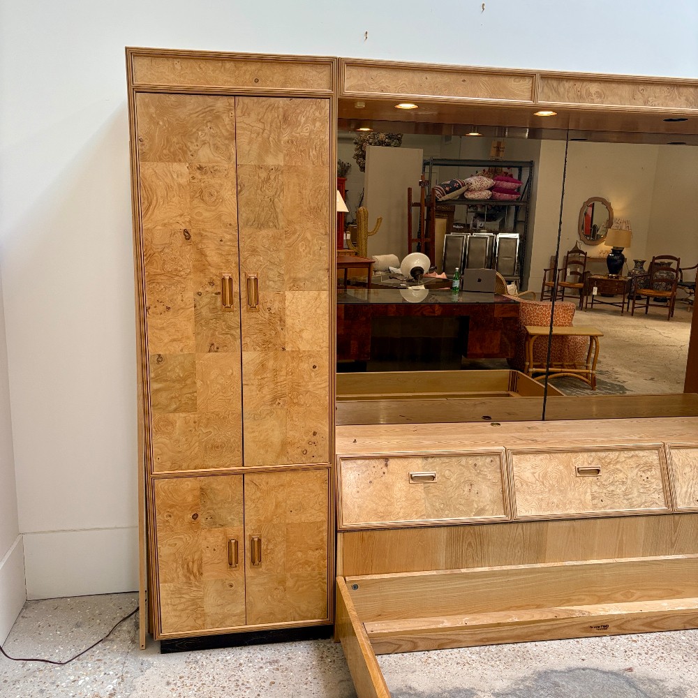 Burled Olivewood Smoked Mirrors King Size Bed 80"w, Armoires 26" w, 82"H